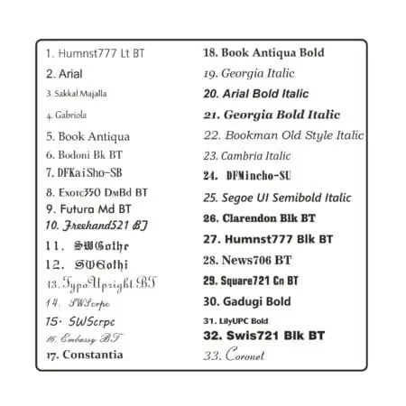 Please look at our font list and choice font number and send me details for engraving.