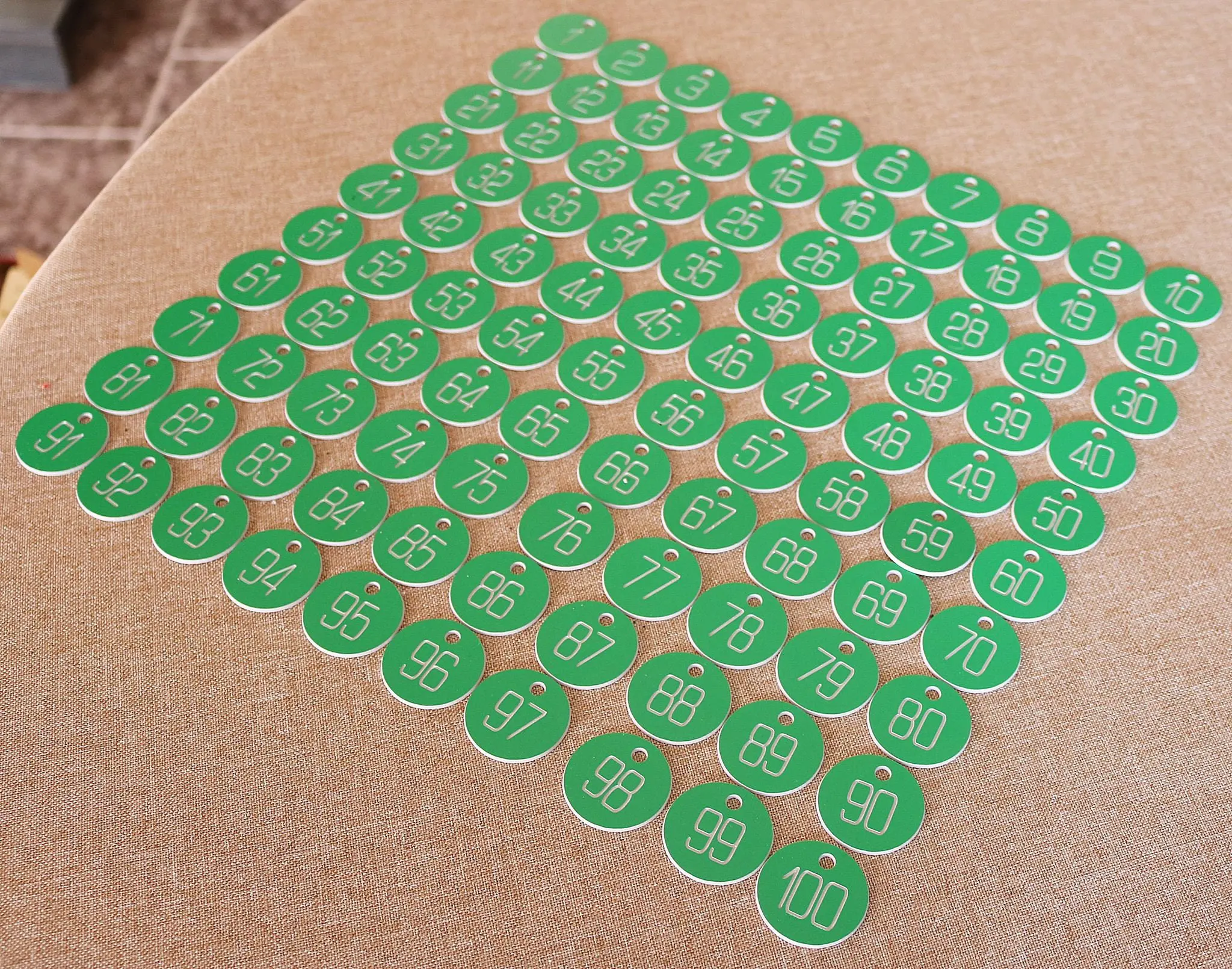Set of 100 round numbered discs ideal for tables, clubs, leisure centres, schools, etc.